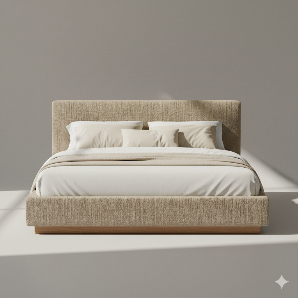A softly upholstered bed designed to create a calm and comfortable bedroom atmosphere with a warm neutral tone.